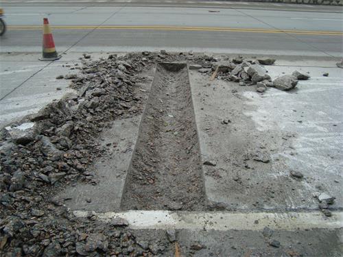 用風鎬鑿除劃線范圍內的混凝土,鑿除深度一般為板厚的二分之一約12cm(不得低于10cm),鑿除時應從劃線內區域向外鑿除,避免出現啃邊現象。如果面板已出現比較嚴重的錯臺、脫空,建議先打孔壓漿后再進行修補。