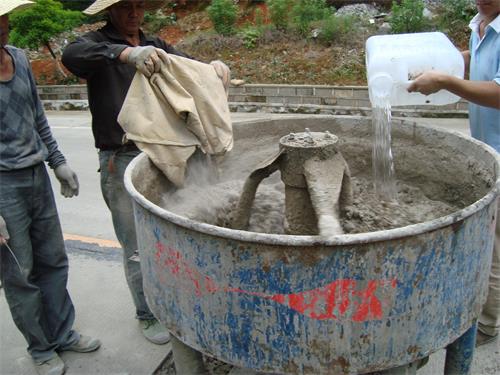 根據修補區域面積計算所需修補材料用量(以單塊路面板為單位計算),盡量做到一次性鋪裝。鋪裝工序及坑槽充分吸水飽和且無明水時進行材料攪拌。用攪拌機先干拌SC型修補料和干凈碎石,修補料與碎石質量比為1:0.8/1(碎石是直徑在10-30㎜連續級配石子,還要經水清洗過),攪拌均勻后,再加干凈的水攪拌,加水量以檢測報告提供的數據為依據,直至攪拌均勻。觀察無干粉球和氣泡,如果仍有干粉球和氣泡,可靜止一分鐘后再攪拌,攪拌時間在3-5分鐘左右為宜,不宜時間過長,防止材料在攪拌機內凝固。注意控制好水灰比,攪拌好的修補料不得泌水。